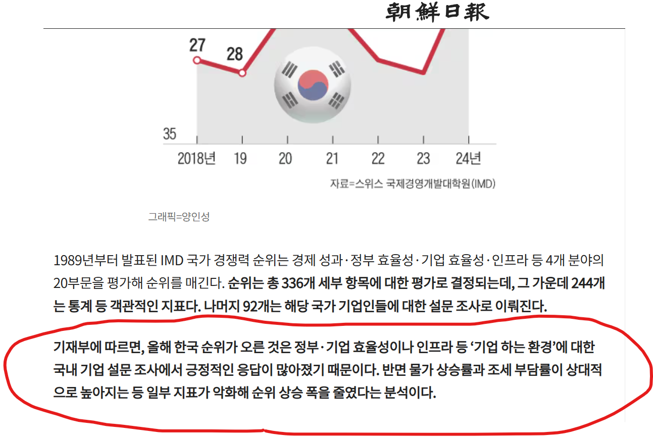 IMD는 작년 지표와 올해 3~5월 설문 결과를 바탕으로 순위를 정했다. 한국은 지난해 28위였지만 올해 8계단 상승했다. 1997년 평가 대상에 포함된 이후 올해 가장 높은 순위를 기록했다.>>78