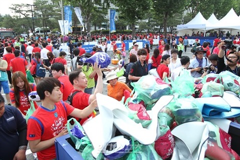この在日韓国人のゴミ集めを見習い、彼は青のビニール袋持参をサポーター仲間に呼びかけた。日本のホームカラーでもある青のビニール袋を膨らませ、スタンドを青一色にするねらいもあったが、本当の目的は試合後のゴミひろいだった。