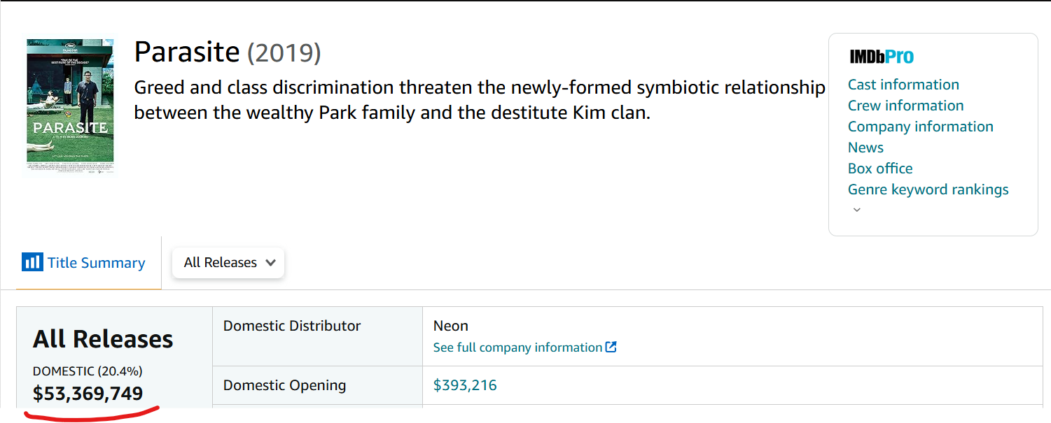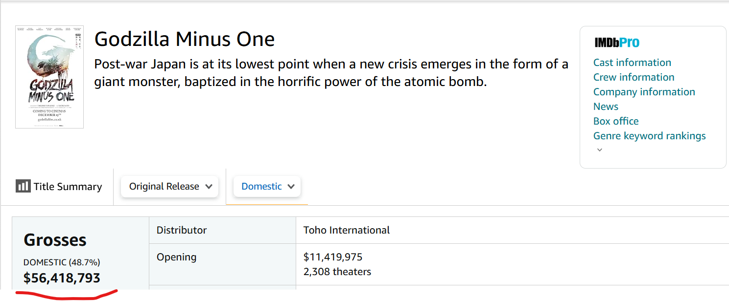 米国アカデミー視覚効果賞も韓国では肯定されないもの。米国で公開された実写の日本映画として史上最高の興行収入を記録し、さらに米国の歴史上3番目に高い興行収入を持つ外国語映画となった。