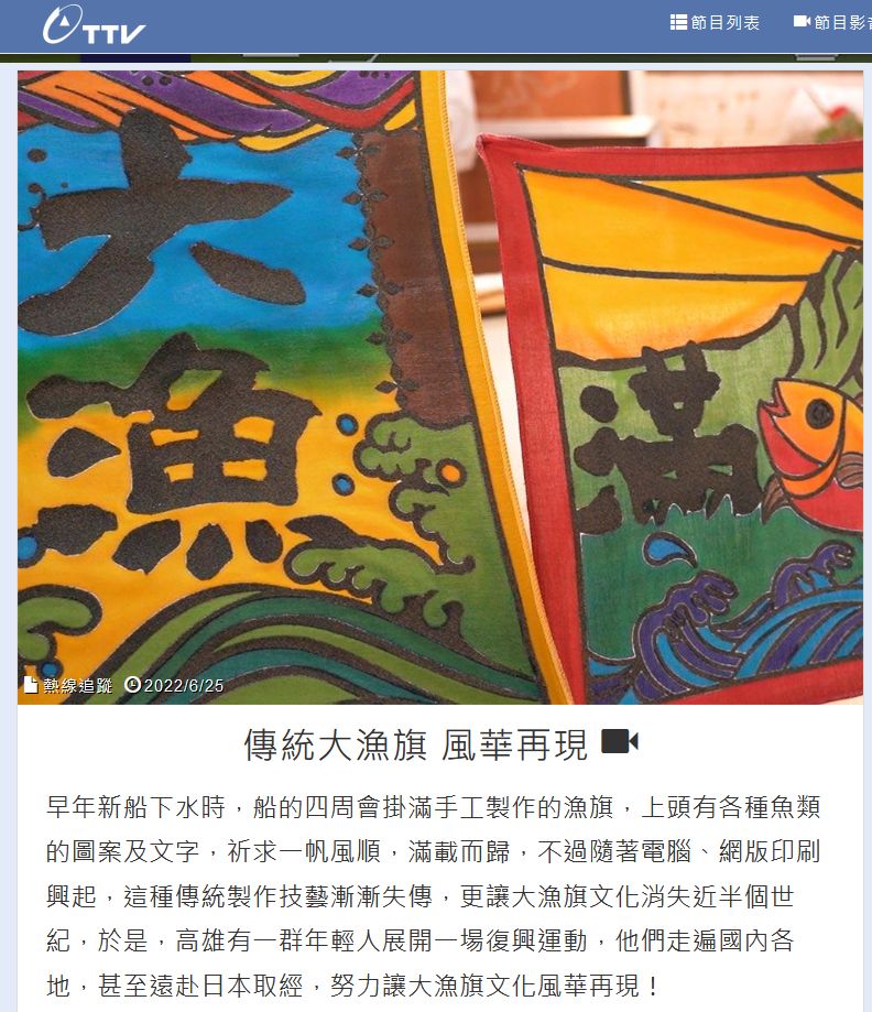早年新船下水時,船的四周會掛滿手工製作的漁旗,上頭有各種魚類的圖案及文字,祈求一帆風順,滿載而歸,不過隨著電腦、網版印刷興起,這種傳統製作技藝漸漸失傳,更讓大漁旗文化消失近半個世紀,於是,高雄有一群年輕人展開一場復興運動,他們走遍國內各地,甚至遠赴日本取經,努力讓大漁旗文化風華再現!
