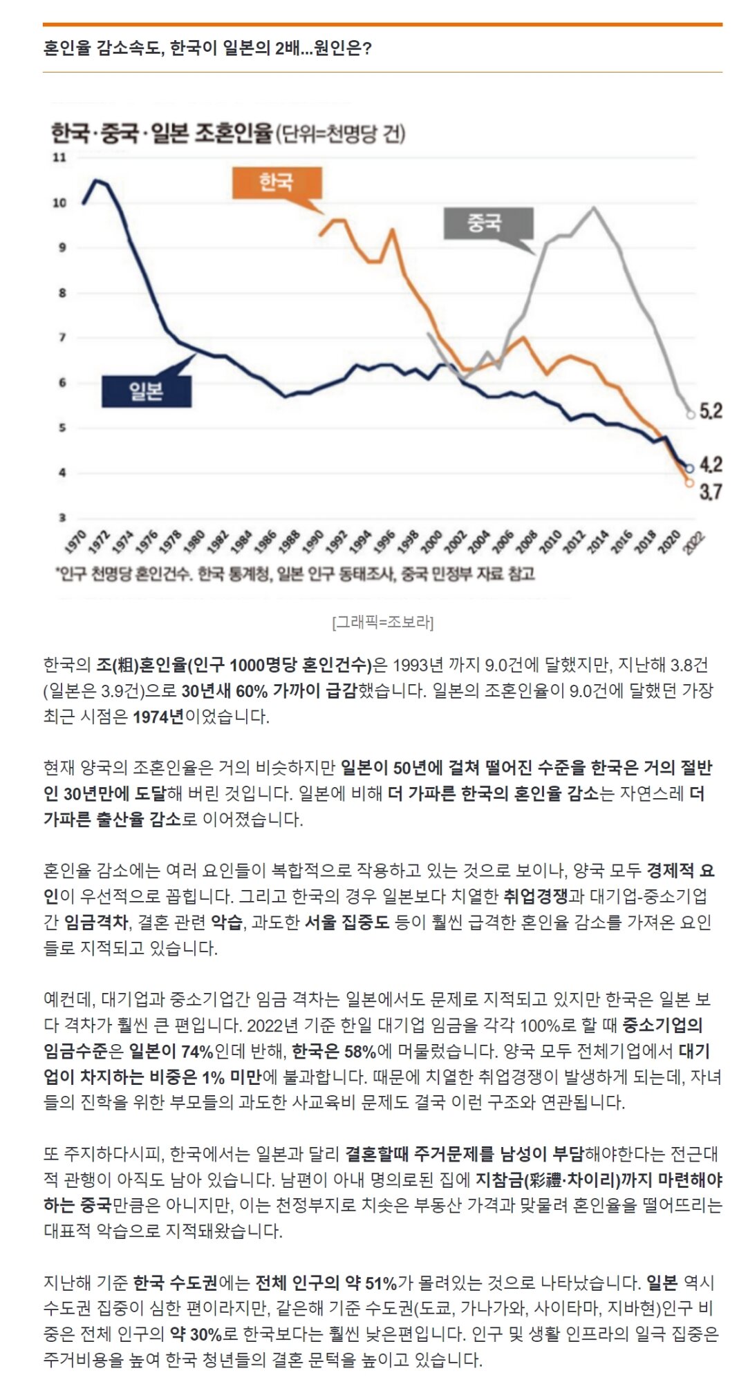 이에 대해 일본의 사회학자이자 독신 연구가인 아라카와 가즈히사씨는 일본도 마찬가지라며 “결혼을 안해서 첫째 아이도 낳지 않게 되는 것이 출산율 감소의 최대 요인” 이라고 지적합니다. 이어 “그리고 일본 이상으로 혼인율 감소가 현저하게 나타나는 나라가 바로 한국”이라고 설명합니다.