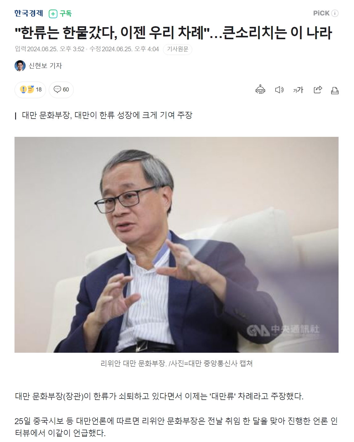 台湾の文化相は「韓流は衰退している」とし「これからは台湾流の番だ」と発言した。