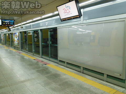 韓国の地下鉄のホームドアは天井まで届いているタイプなのです。