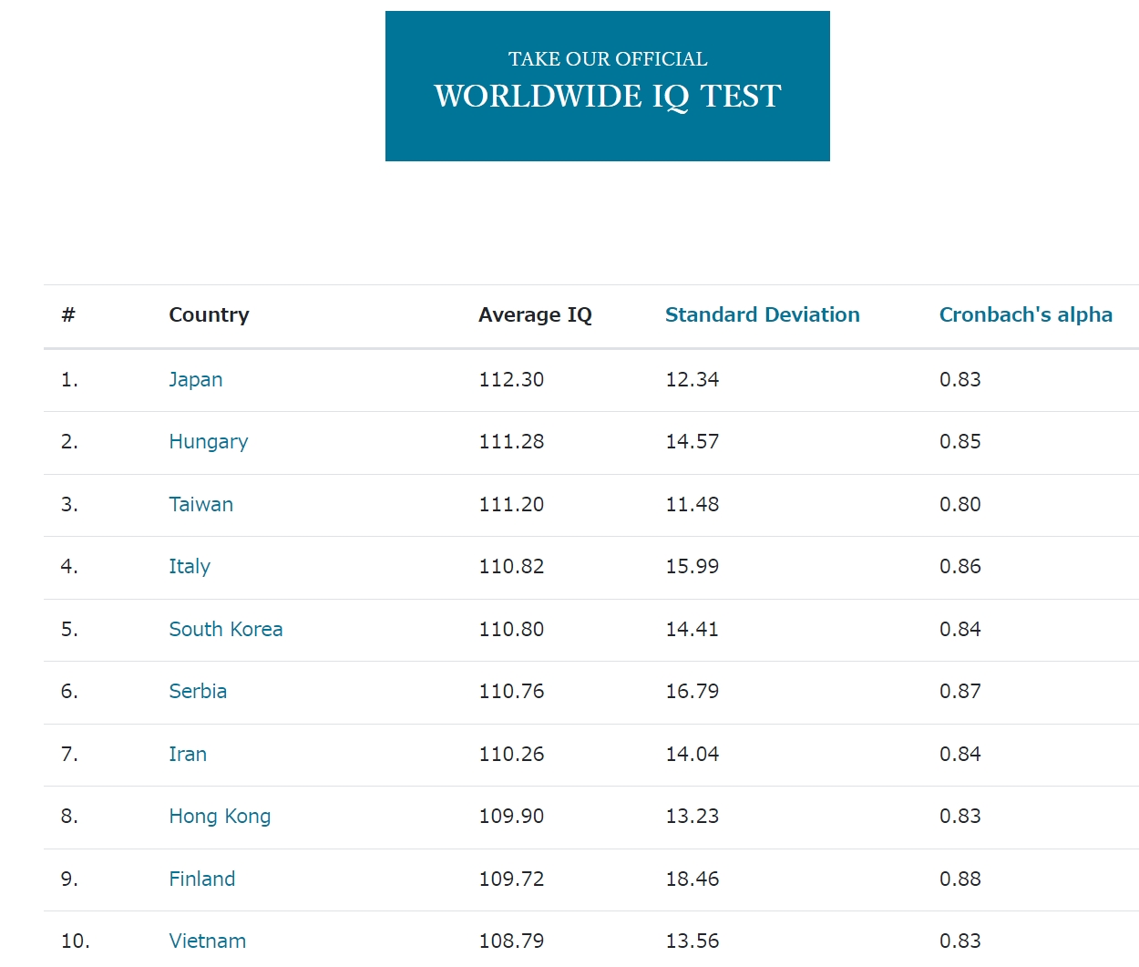 https://www.worldwide-iq-test.com/iq-tests世界で最も恥的な国は韓国。