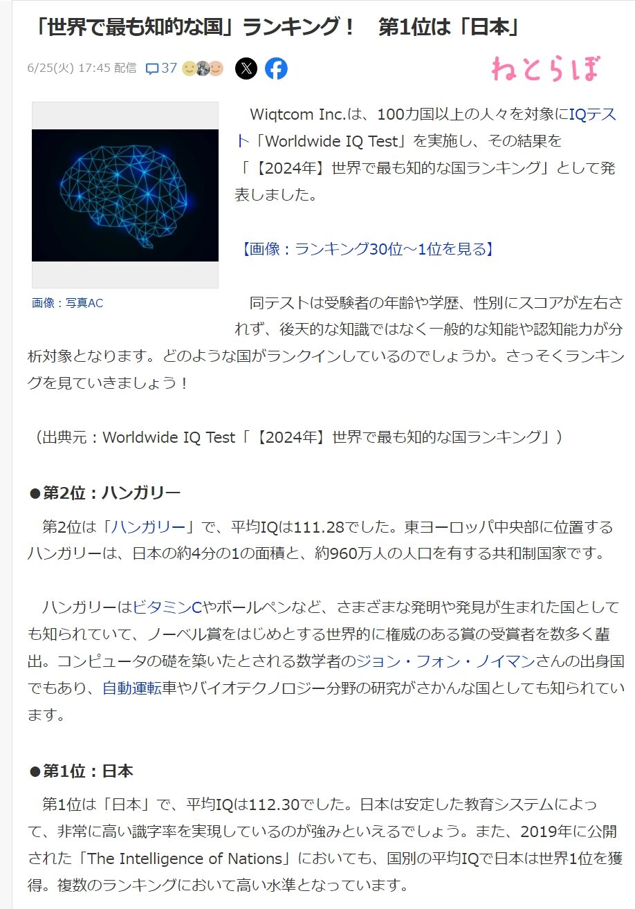 Wiqtcom Inc.は、100カ国以上の人々を対象にIQテスト「Worldwide IQ Test」を実施し、その結果を「【2024年】世界で最も知的な国ランキング」として発表しました。