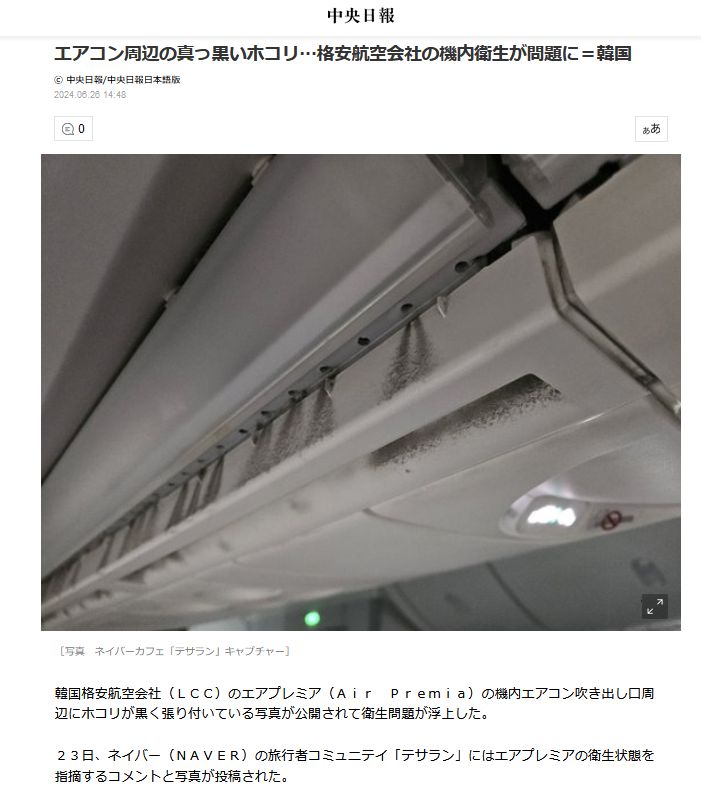 韓国格安航空会社(LCC)のエアプレミア(Air Premia)の機内エアコン吹き出し口周辺にホコリが黒く張り付いている写真が公開されて衛生問題が浮上した。