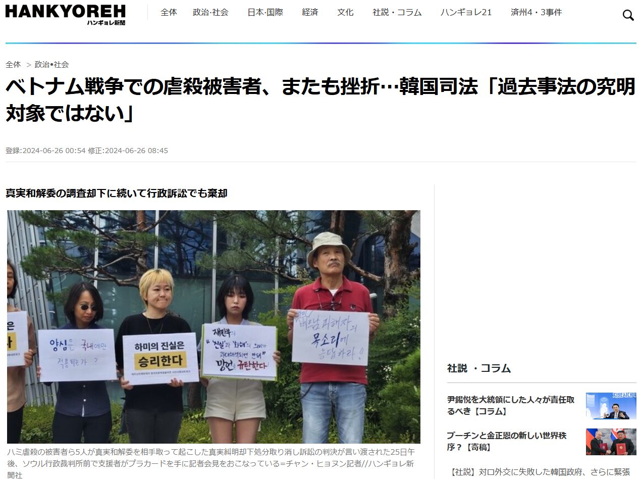 ソウル行政裁判所行政8部(イ・ジョンヒ裁判長)は25日、ベトナム人のグエン・ティ・タンさん(67)ら5人が真実和解委を相手取って起こした真実和解委却下処分取り消し訴訟で、「外国で起きた人権侵害事件まで(真実究明の対象に)含めることは、過去事整理法の目的に合致しない」として、原告の請求を棄却した。