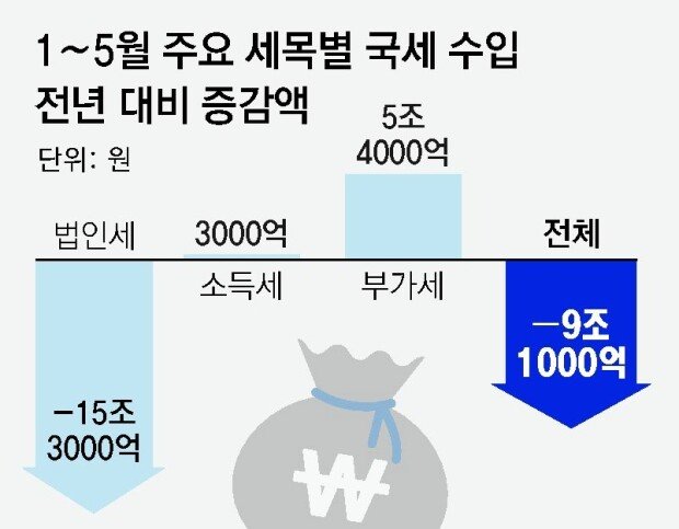 今年も税収が予想より少なくなったのは法人税減少の影響が大きかった。1~5月の法人税税収は28兆3000億ウォンで、前年比15兆3000億ウォン減少した。