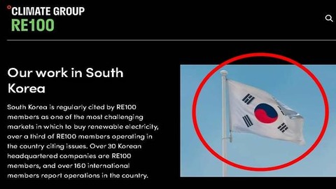 環境に関する世界的なキャンペーン「RE100」のホームページに逆さまにされた太極旗の写真がアップされ、議論を呼んでいます。