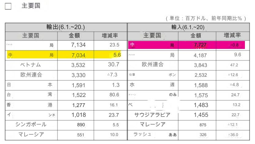 韓国06月中盤。輸出は米国頼みに移行し、対中国で7億ドル赤字