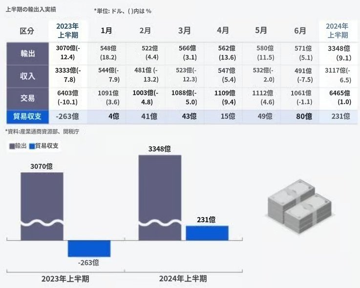 1日、産業通商資源部が発表した「2024年上半期および6月輸出入動向」によると、先月の輸出は前年同期対比5.1%増加した570億7,000万ドル、輸入は7.5%減少した490億7,000万ドルだった。 貿易収支は80億ドルの黒字を記録し、9ヵ月連続で輸出プラスを続けた。 これにより、今年上半期(1~6月)の輸出は前年比9.1%増の3348億ドル、貿易収支は2018年(311億ドル)以降、上半期基準で最大規模の231億ドルの黒字となった。