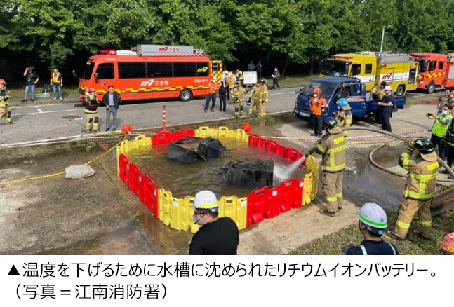 しかし、リチウム火災だけのための対応マニュアルと専用消火装備がない状況だ。 一般火災マニュアルに従って対応するという。 (中略)