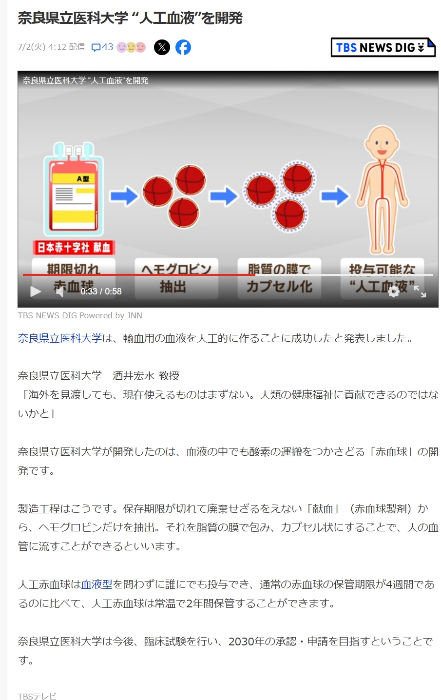 https://l.smartnews.com/m-luS0Jgs/z6KPVO日本、「万能人工血液」を開発 血液型不問で2年間保存可能 2030年の実用化を目指す