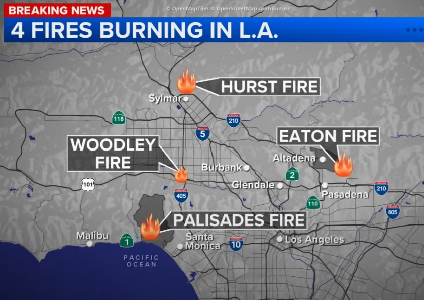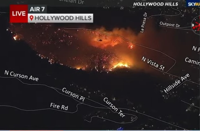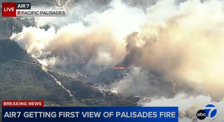 現在、米国カリフォルニア州ロサンゼルス西部で山火事が発生して広範囲で炎上中。