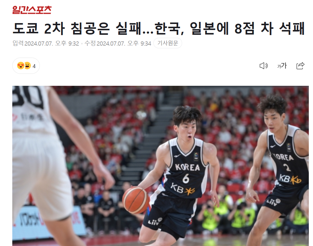일본, 한국에게 농구 한일전 패배