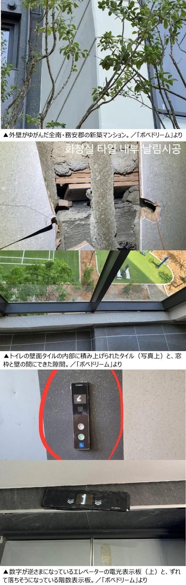 インターネットのコミュニティーサイト「ボベドリーム」には6日「過去最大級の欠陥が見つかった新築マンション」とのタイトルで、入居予定者らが撮影した複数の写真が投稿された。写真には、マンションの外壁や階段、エレベーター、共用部分の壁面などが写っている。問題が見つかったマンションは、全羅南道務安郡の「ヒルステート五竜」だ。