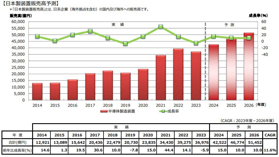 25年度はロジック・ファウンドリー、メモリー全体で堅調な投資が予想されるため、10.0%増の4兆6774億円とした。26年度も、半導体の需要押し上げ効果が人工知能(AI)関連で顕在化することから、10.0%増の5兆1452億円を予想する。