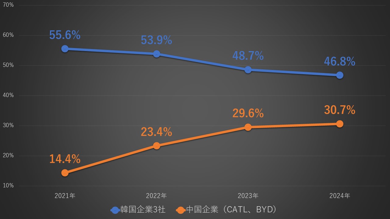 中国企業にとってちょっとフェアではないのですが、中国最大手の『CATL』『BYD』の2社を合算して、上記韓国3社と世界シェアの推移を比較すると以下のようになります。
