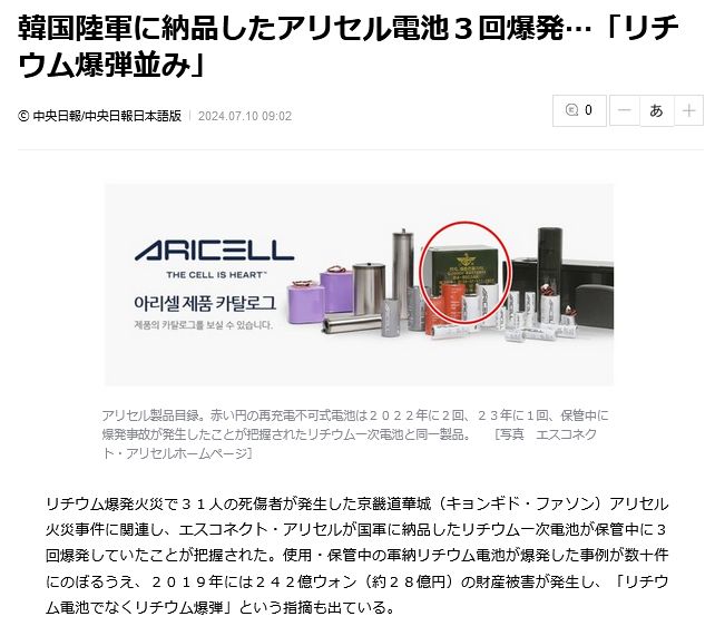 リチウム爆発火災で31人の死傷者が発生した京畿道華城(キョンギド・ファソン)アリセル火災事件に関連し、エスコネクト・アリセルが国軍に納品したリチウム一次電池が保管中に3回爆発していたことが把握された。使用・保管中の軍納リチウム電池が爆発した事例が数十件にのぼるうえ、2019年には242億ウォン(約28億円)の財産被害が発生し、「リチウム電池でなくリチウム爆弾」という指摘も出ている。