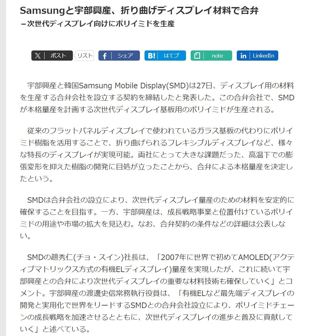 Samsungと宇部興産、折り曲げディスプレイ材料で合弁