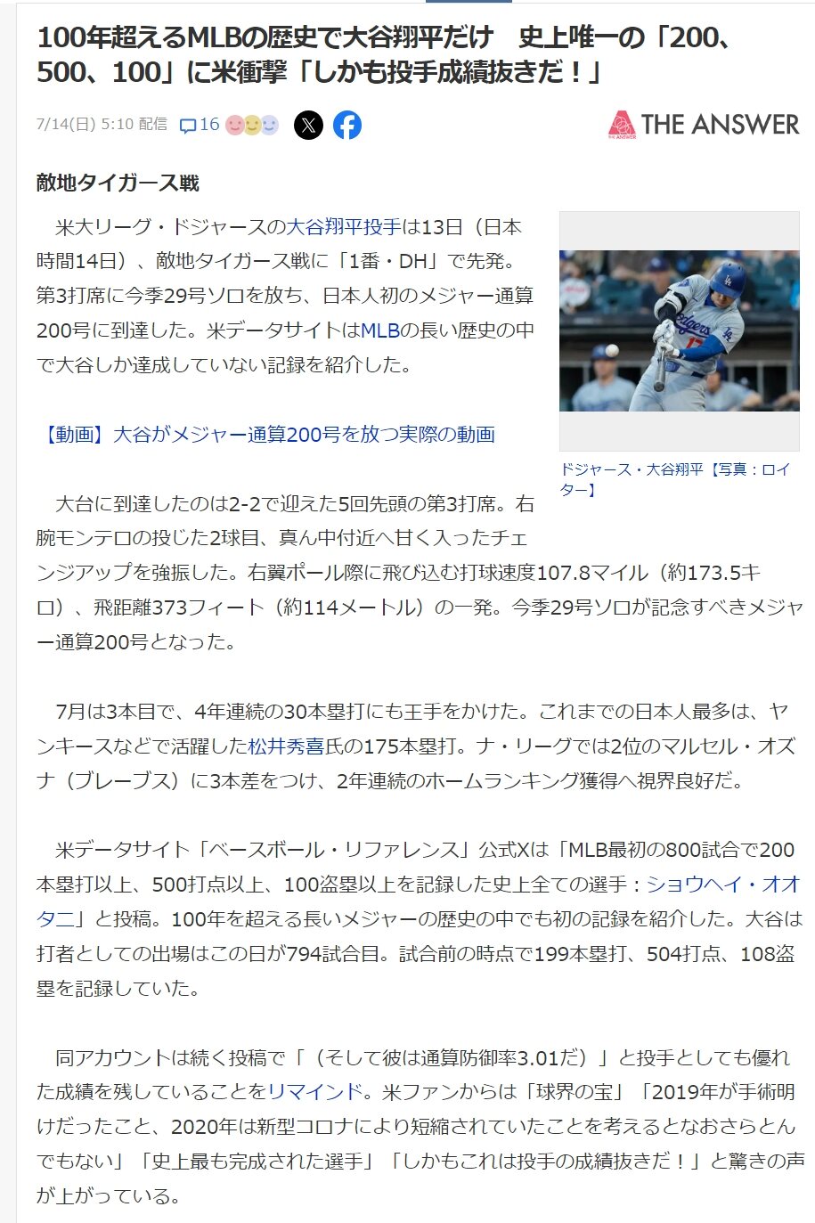 米大リーグ・ドジャースの大谷翔平投手は13日(日本時間14日)、敵地タイガース戦に「1番・DH」で先発。第3打席に今季29号ソロを放ち、日本人初のメジャー通算200号に到達した。米データサイトはMLBの長い歴史の中で大谷しか達成していない記録を紹介した。