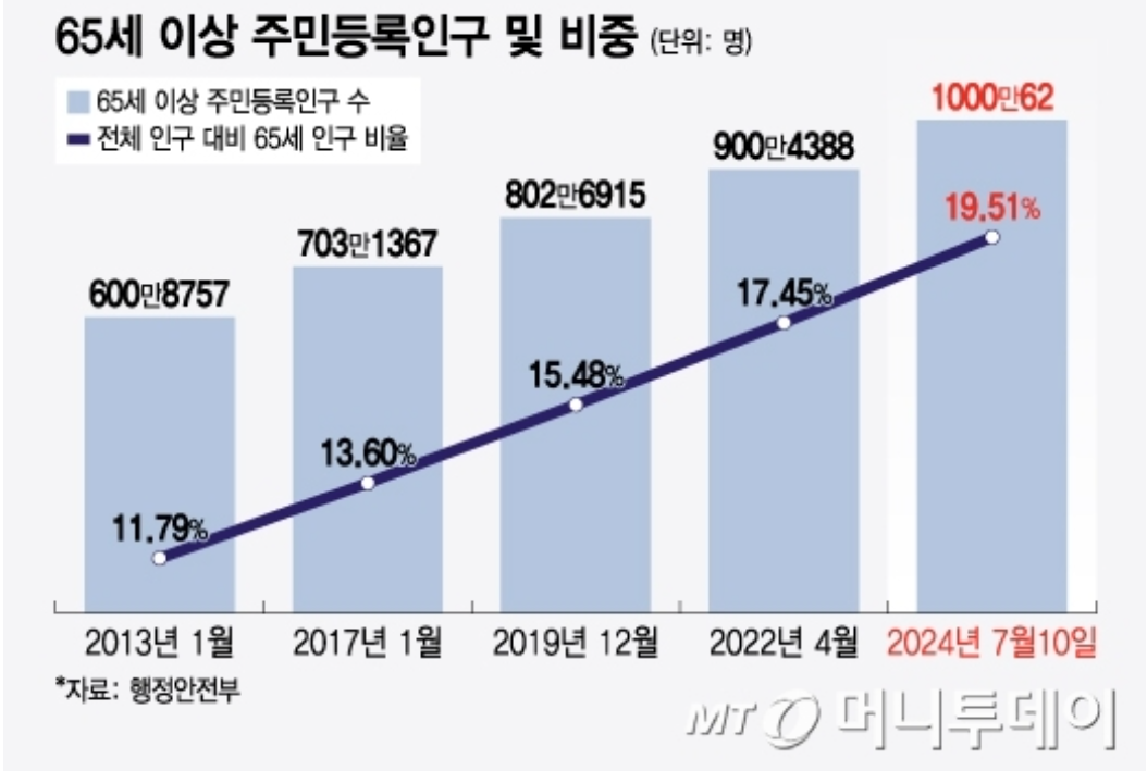 行政安全部は前日(10日)基準で65歳以上の住民登録人口が1000万62人に達したと11日に発表した。これは全体住民登録人口5126万9012人の19.51%を占める。国連(UN)は全体人口のうち65歳以上の人口が20%を超えると超高齢社会に分類する。事実上、年内に超高齢社会に突入する見通しだ。