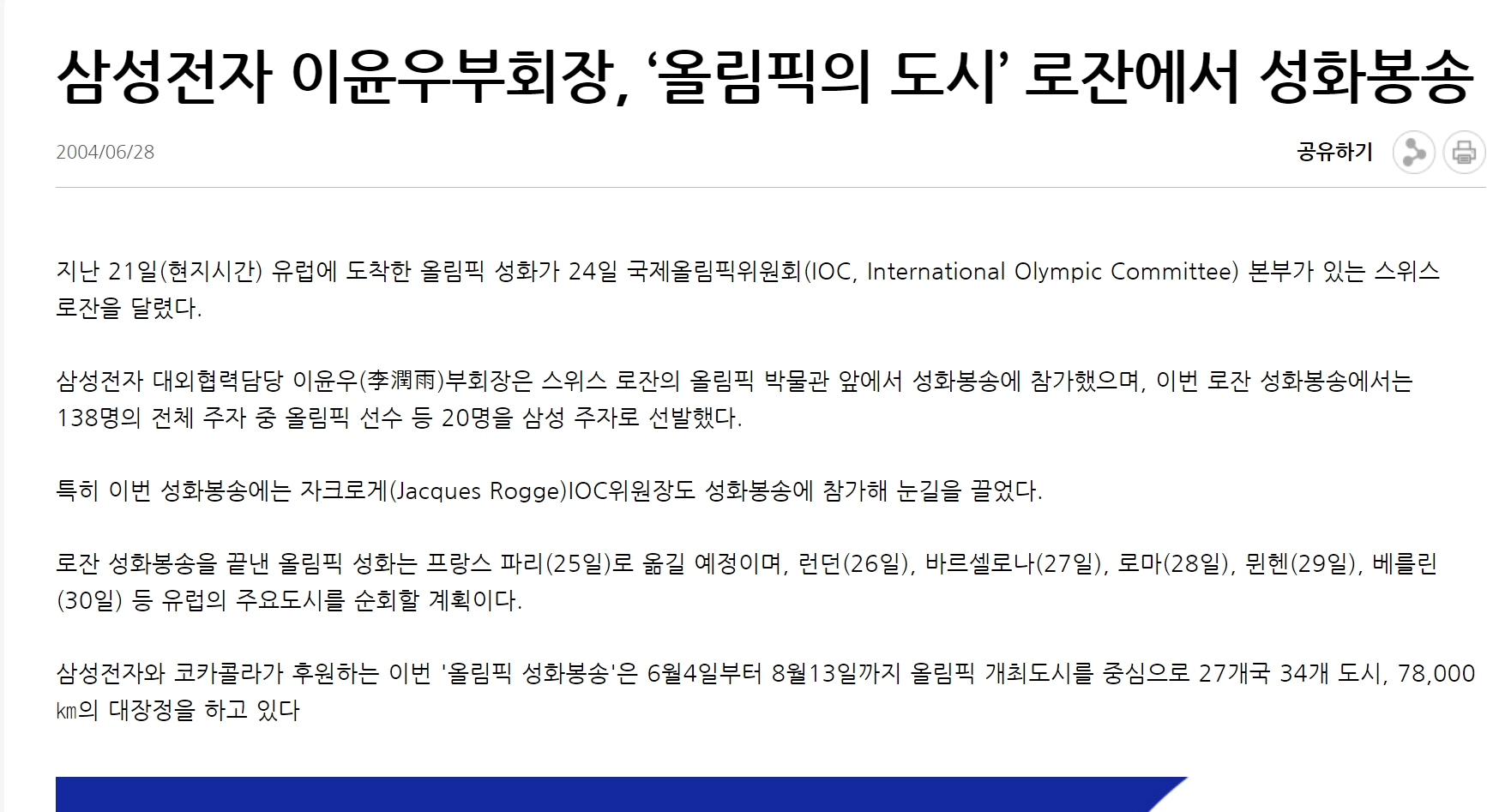 サムスン電子のイ・ユヌ副会長が「オリンピックの街」ローザンヌで聖火を運ぶ!もう、スポーツ界隈で隣国の方々は諦めてもらって。このような分野に全振りしてもらった方が「恨(ハン)」を信奉する方々にはちょうどいいのではないかな~。