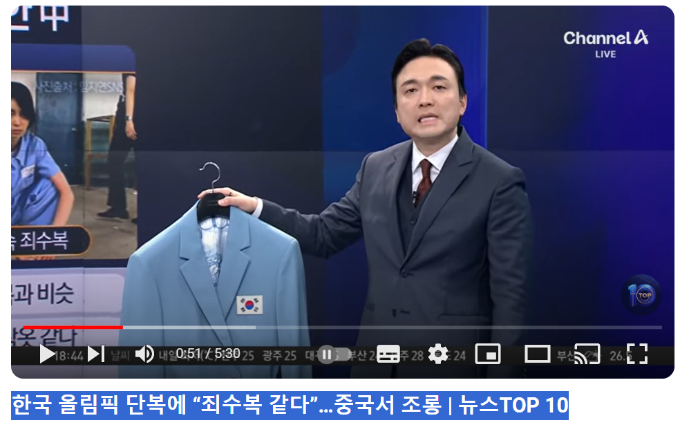 これは、碧青色(ターコイズブルー)の韓国代表ユニホームと、青い囚人服の色が似ていると言ってバカにしているものだ。この動画は、中国のSNS「百度(バイドゥ)」をはじめ、「騰訊網(テンセント)」「捜狐(Sohu)」「bilibili(ビリビリ)」などにも掲載されている。他にも「韓国のユニホームはパジャマのようだ」「純粋に刑務所スタイル」などの反応もあった。ジャケットの上に巻いたベルトについては「バスローブか」などのコメントもあった。