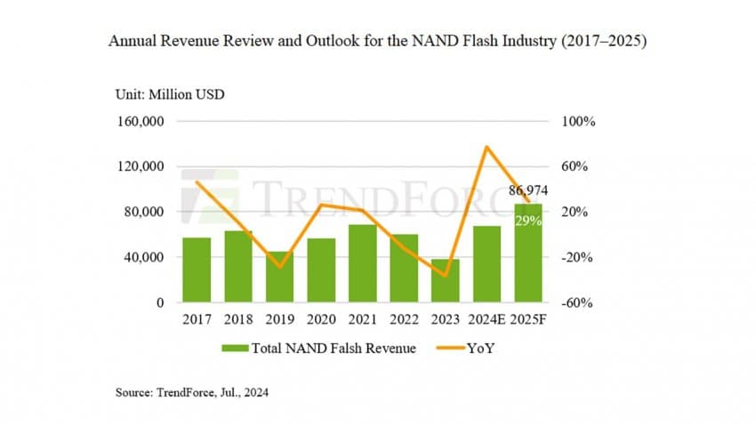 TrendForceはNANDの売上が2024年に662億ドルに達すると展望し、これは前年対比77%増加した数値です。 2025年には大容量QLC eSSDの増加、スマートフォンでのQLC UFSの採用、メーカーの限られたCapEx支出による供給制限、サーバー需要の回復に支えられ、NANDの売上が870億ドルに達すると予想され、これは前年比29%増加した数値です。