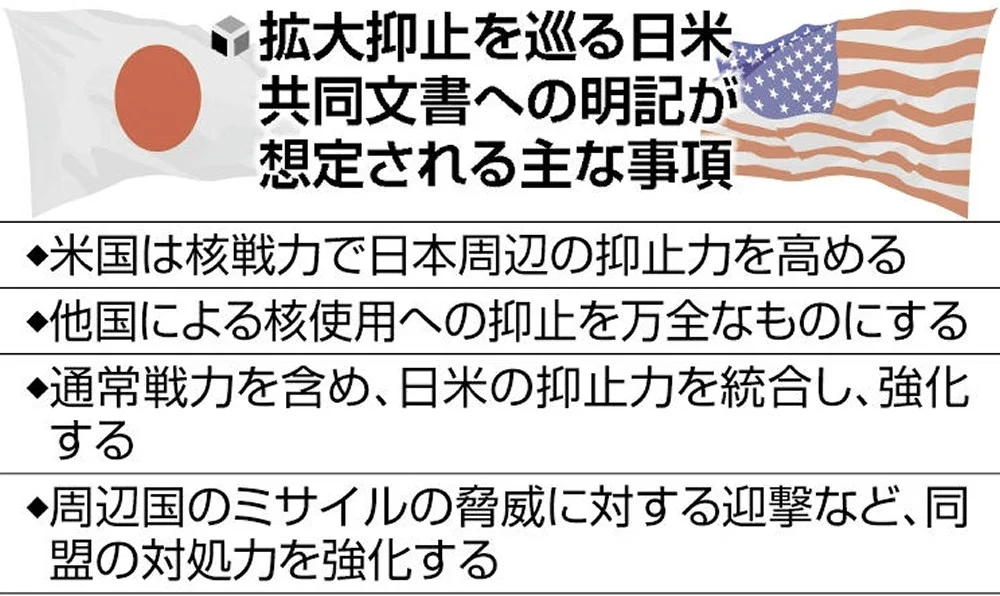 具体的には、米国が核兵器などを通じて日本周辺の抑止に貢献するとの決意を文書に盛り込む。日本がどのような事態に直面した場合、米国が第三国に対する報復を実施するか――など、平時から有事までを想定して米側が提供する能力について整理し、方向性を記すものとみられる。