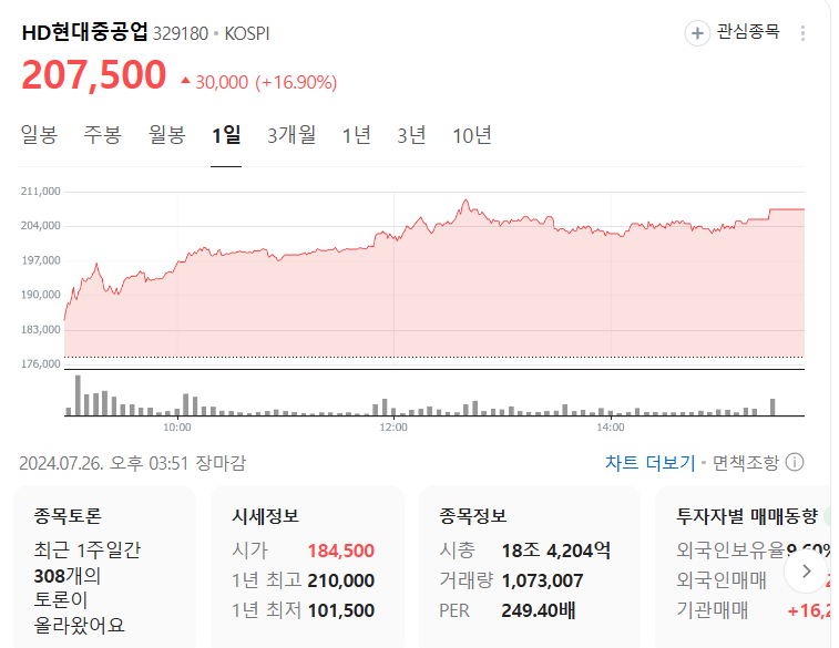 HD現代の造船·海洋部門の中間持株会社であり、世界1位の造船業者であるHD韓国造船海洋が業況好調に支えられ、今年第2四半期に400%を越える営業利益増加率を記録した。