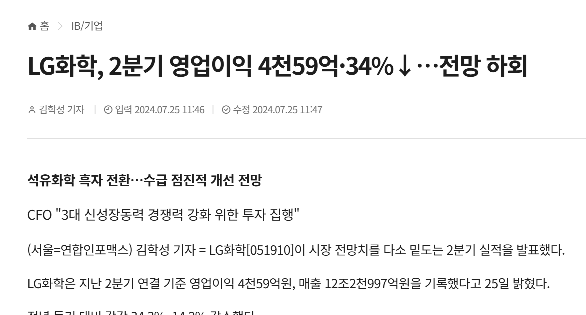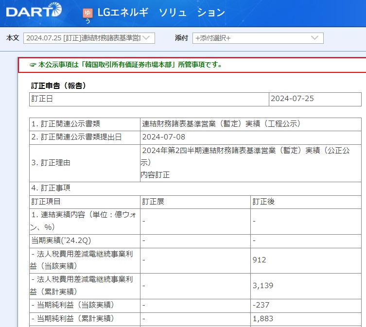 の3社ですが、韓国最大手では『LGエネルギーソリューション』になります。2024年07月25日に「2024年第2四半期」の業績が公示されたのですが……以下をご覧ください。