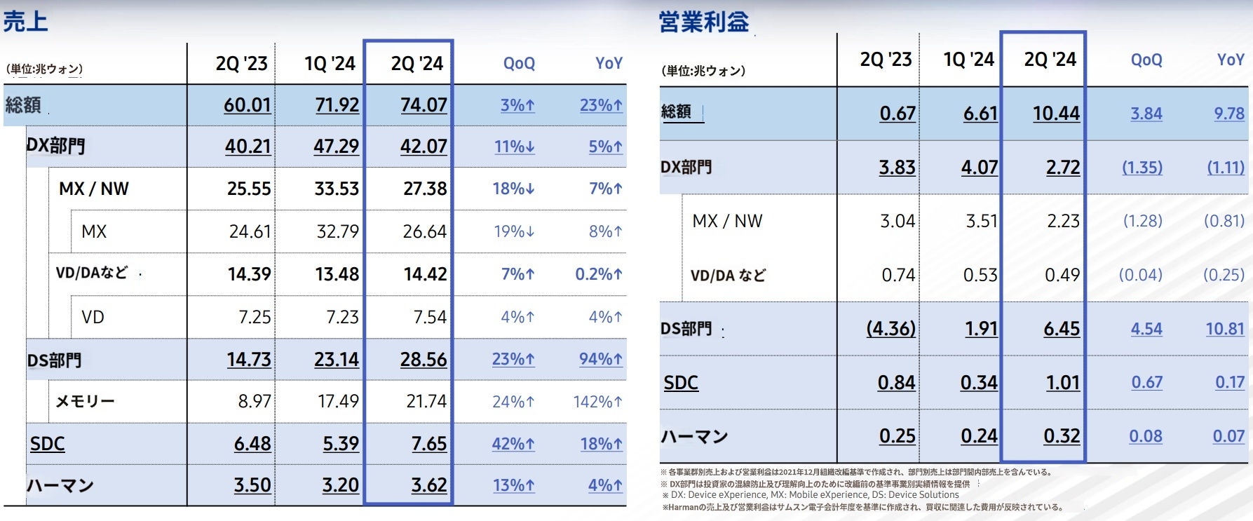 サムスン電子は31日、連結基準で今年第2四半期の営業利益が昨年同期より1462.29%増加した10兆4400億ウォンを記録したと公示した。