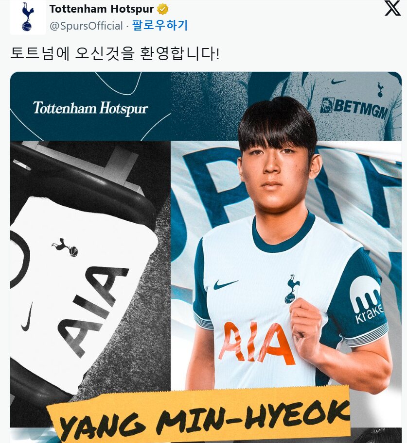 [오피셜] 토트넘 핫스퍼, 양민혁 영입