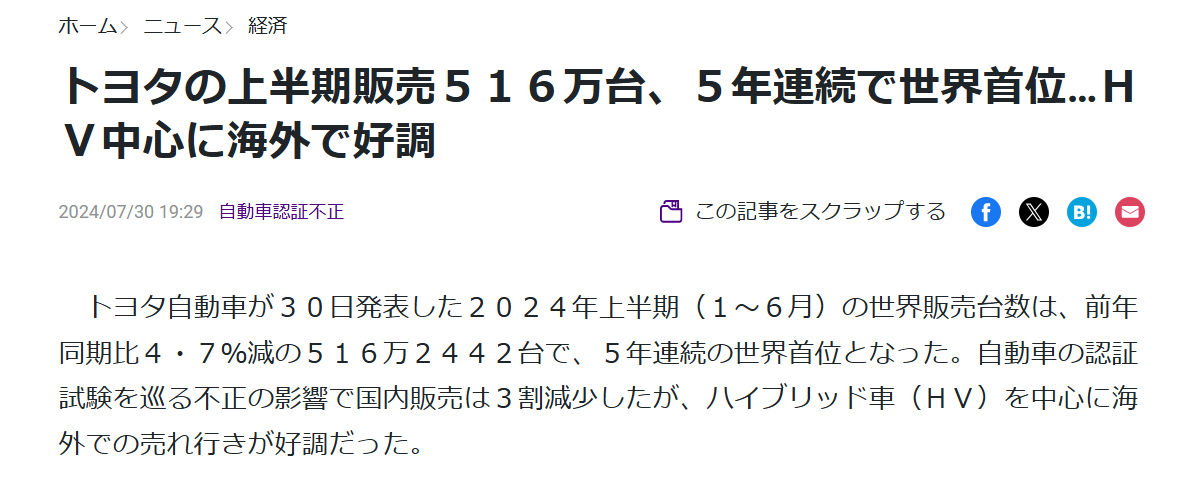 トヨタの上半期販売516万台、5年連続で世界首位…HV中心に海外で好調