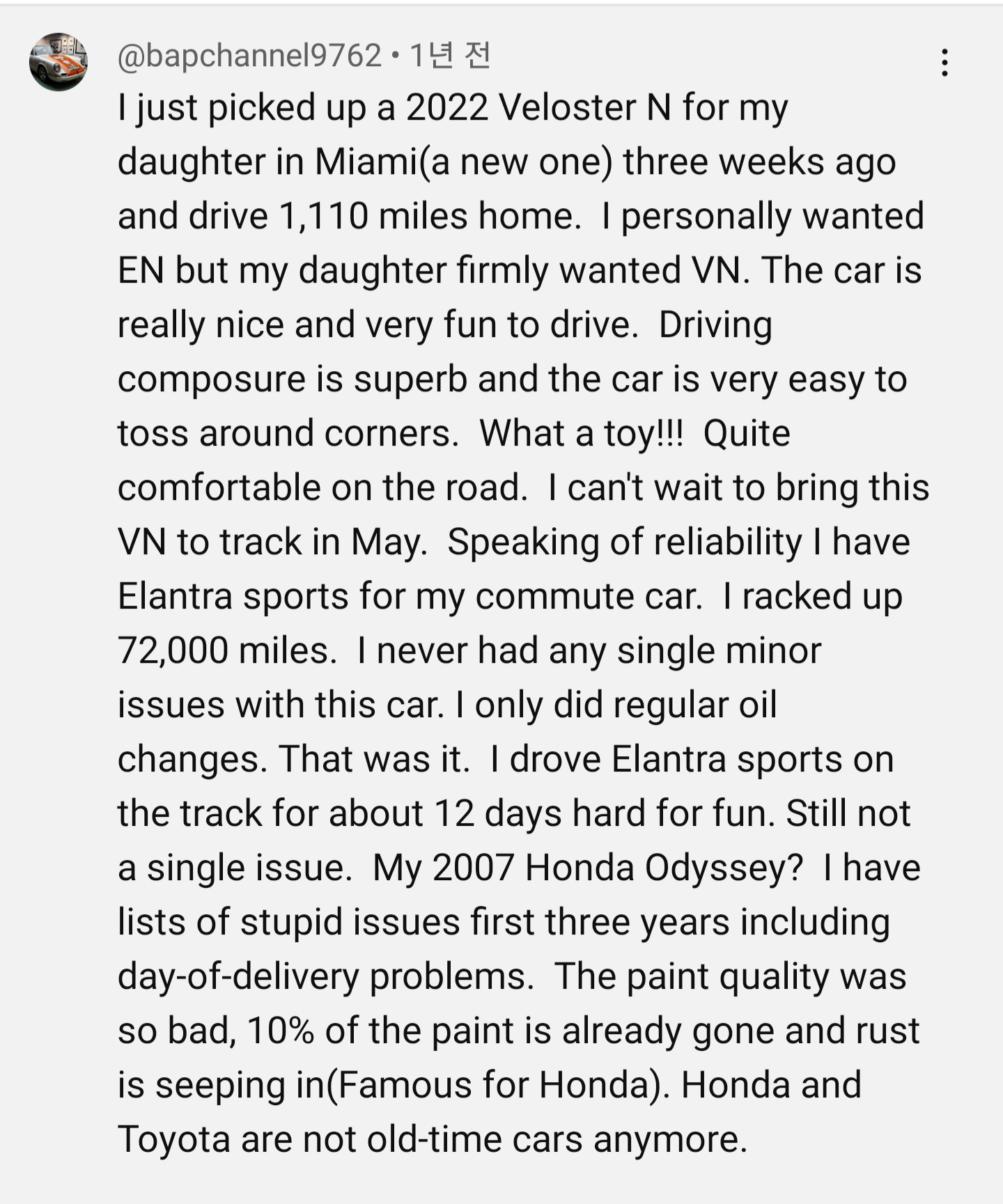 VN을 추적할 수 있기를 기대합니다. 신뢰성에 관해 말하면 저는 출퇴근 차량에 Elantra 스포츠를 가지고 있습니다. 72,000마일을 주행했습니다. 나는이 차에 사소한 문제가 하나도 없었습니 다. 정기적인오일교환만 했습니다. 그게 다야. 재미삼아 12일 정도 열심히 트랙에서 엘란트라스포츠를 몰았습니다. 아직 단일 문제는 아닙니다. 내 2007 혼다 오디세이요구 배송 당일 문제를 포함하여 처음 3년 동안 발생한 어리석은 문제 목록이 있습니다. 페인트 품질이 너무 나빴기 때문에 이미 페인트가 10%나 사라졌고 녹이 스며들고 있었습니 다(혼다로 유명함). 혼다와 도요타는 더이상 옛날차가아니다.- 72