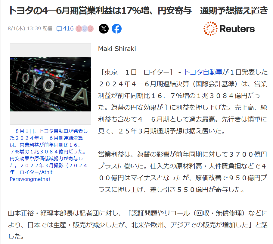 [東京 1日 ロイター] - トヨタ自動車が1日発表した2024年4―6月期連結決算(国際会計基準)は、営業利益が前年同期比16.7%増の1兆3084億円だった。為替の円安効果が主に利益を押し上げた。売上高、純利益も含めて4─6月期として過去最高。先行きは慎重に見て、25年3月期通期予想は据え置いた。