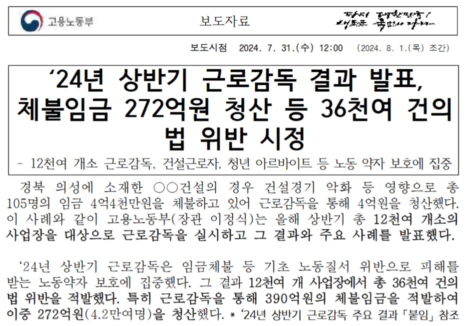 https://n.news.naver.com/mnews/hotissue/article/003/0012705156?type=series&cid=20000122024年07月31日、韓国の雇用労働部のデータによると、2024年上半期の賃金滞納の総額が1兆ウォンを超えたことが分かりました。