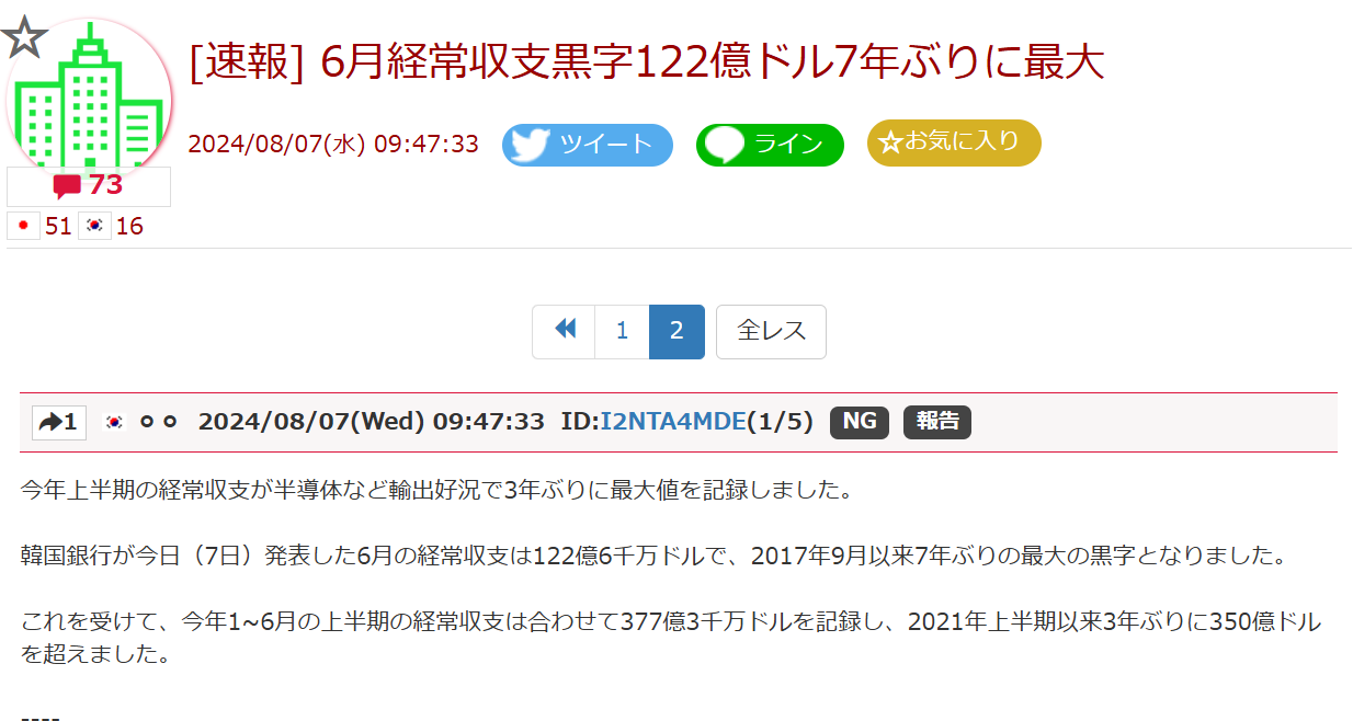 >韓国、今年1~6月の上半期の経常収支は合わせて377億3千万ドルを記録