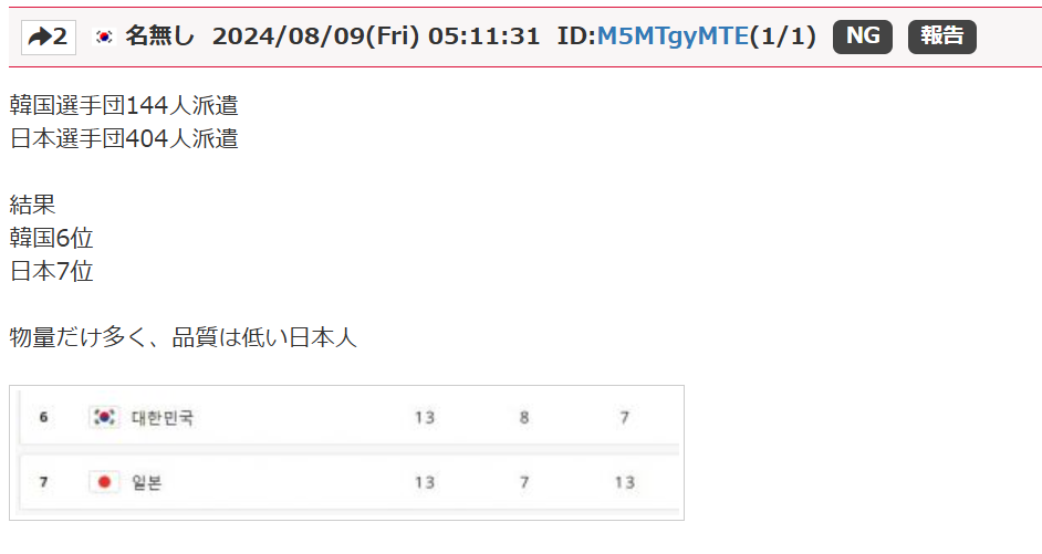 オリンピックでさえ、、北朝鮮と区別がされていないことが全てを表している。w朝鮮人は比較対象を日本とするから火病を起こすんだよ