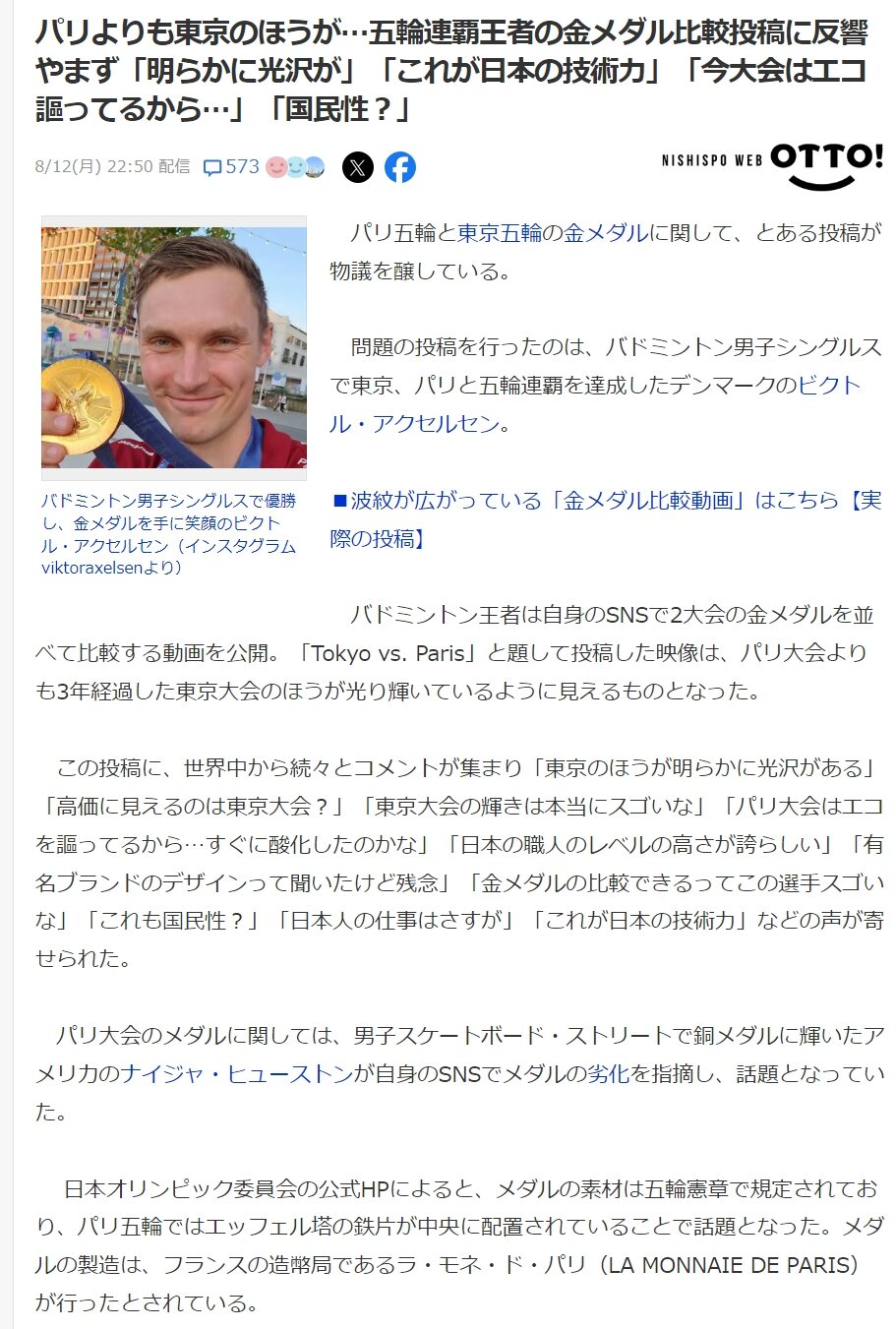 バドミントン王者は自身のSNSで2大会の金メダルを並べて比較する動画を公開。「Tokyo vs. Paris」と題して投稿した映像は、パリ大会よりも3年経過した東京大会のほうが光り輝いているように見えるものとなった。