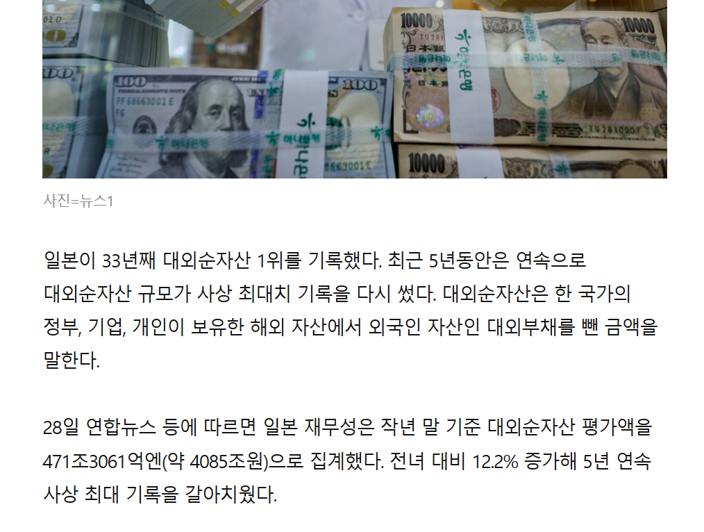 韓国銀行が21日発表した「2024年第2四半期国際投資対照表(暫定)」によると、今年第2四半期末の韓国の純対外金融資産は第1四半期(8310億ドル)より275億ドル増加した8585億ドルと集計された。 第1四半期の発表当時、従来の最高値だった2022年第3四半期(8283億ドル)を更新したのに続き、2四半期連続の最高値更新だ。