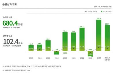 国民年金公団基金運用本部は29日、今年6月末基準で収益率9.71%、運用収益金102兆4000億ウォンを記録したと暫定集計したと明らかにした。 1988年に国民年金制度が導入されて以来、計680兆4000億ウォンの累積収益金が積み立てられ、1147兆ウォンの基金が積み立てられた。