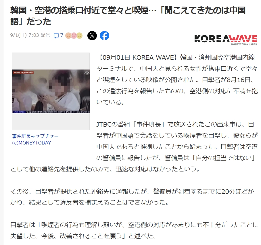 【09月01日 KOREA WAVE】韓国・済州国際空港国内線ターミナルで、中国人と見られる女性が搭乗口近くで堂々と喫煙をしている映像が公開された。目撃者が8月16日、この違法行為を報告したものの、空港側の対応に不満を抱いている。