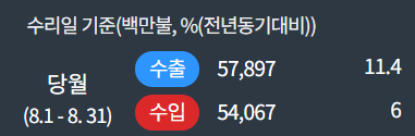 1日、産業通商資源部が発表した「8月輸出入動向」によると、輸出は1年前より11.4%増加した579億ドル(77兆5281億ウォン)を記録した。