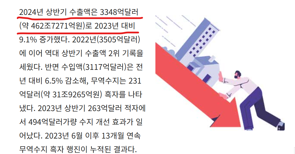 ドル・ウォン相場は過去1年間、ほぼ1ドル=1300ウォン台前半から半ばのウォン安水準を維持してきたが、「ウォン安は輸出企業に有利」という公式がまともに働いていない。通常はウォン安になれば、外貨建てで韓国製品の価格が安くなるため、輸出企業に有利と言われている。しかし、自動車・鉄鋼など一部業種では、輸出企業の販売戦略の変化と現地生産拡大などが影響し、為替効果がほとんどなくなっていると分析されている。また、貿易収支は全体で10カ月連続黒字と好調に見えるが、半導体を除けば、過去1年間の累積貿易赤字は約319億ドルに上る。