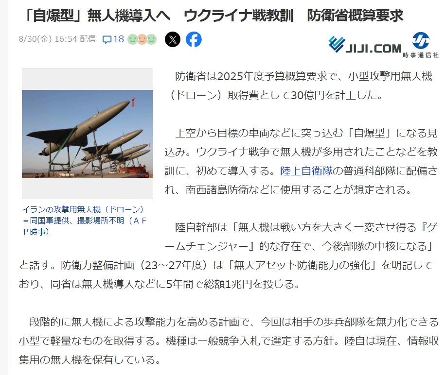 上空から目標の車両などに突っ込む「自爆型」になる見込み。ウクライナ戦争で無人機が多用されたことなどを教訓に、初めて導入する。陸上自衛隊の普通科部隊に配備され、南西諸島防衛などに使用することが想定される。