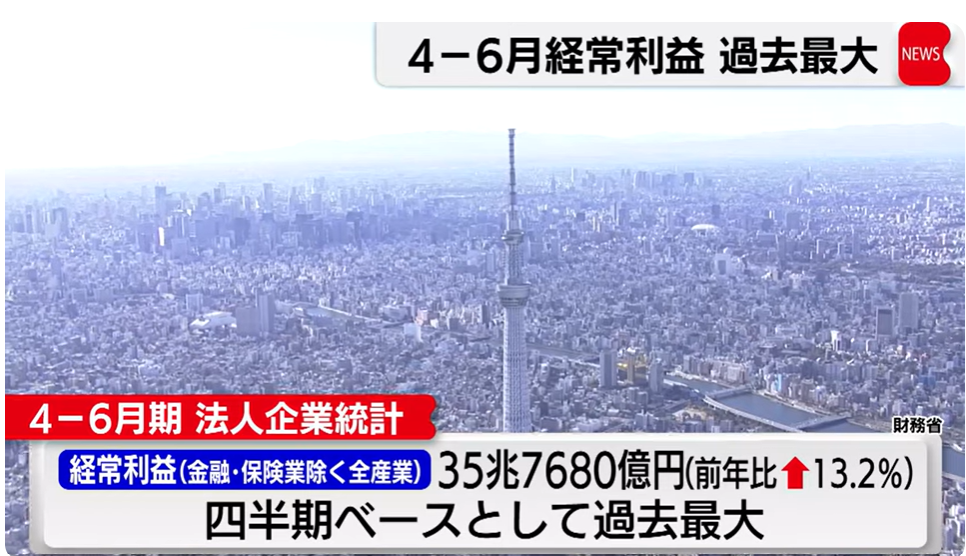 財務省が2日発表した2024年4~6月期の法人企業統計は、金融・保険業を除く全産業の経常利益が前年同期比13.2%増の35兆7680億円で、四半期ベースとして比較可能な1954年以降で過去最大となった。プラスは6四半期連続。歴史的な円安により輸出企業を中心に収益が押し上げられたとみられる。インバウンド(訪日客)の伸びも寄与した。