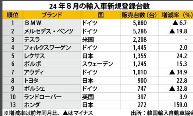 車種別ではテスラのスポーツタイプ多目的車(SUV)「モデルY」が1,215台でトップだった。7位にはレクサスのセダンタイプのHV「ES300h」(582台)がランクインした。朝鮮人の買ってるドイツ車って中国生産だからな。