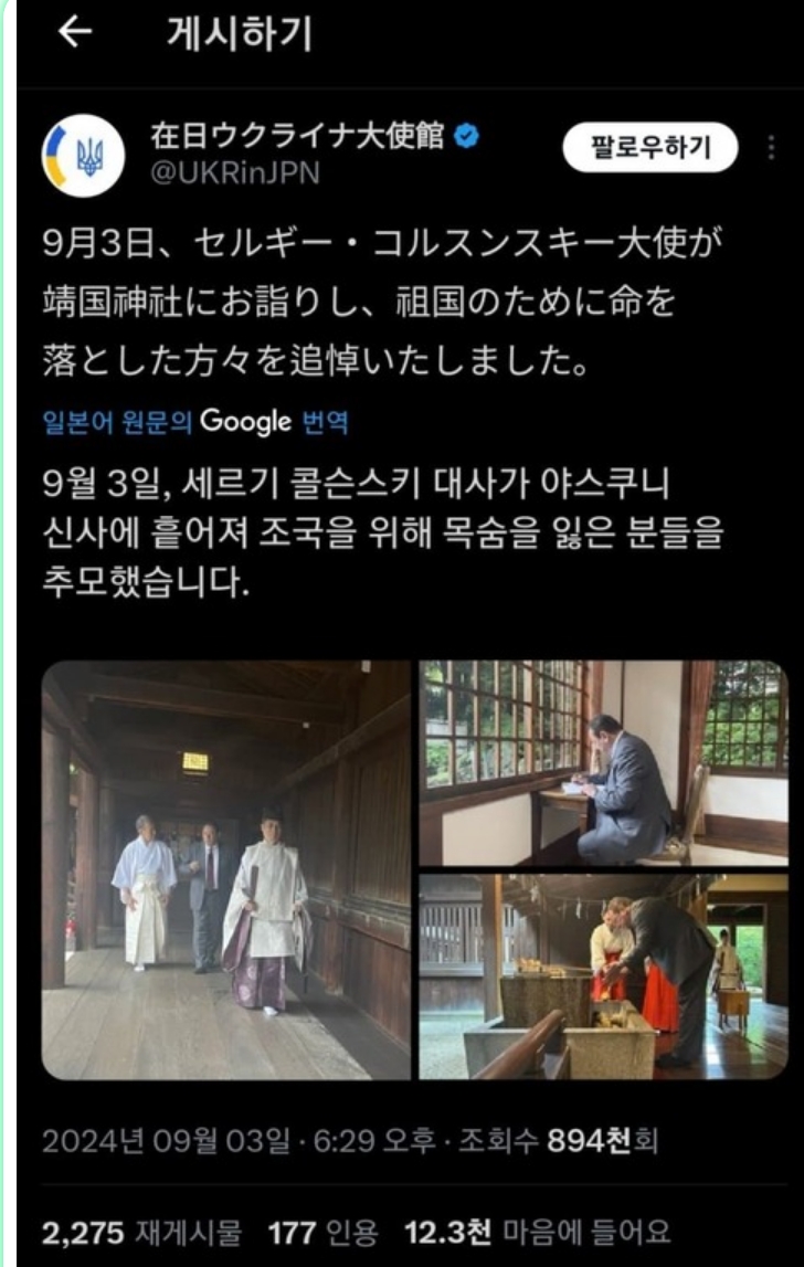 在日本ウクライナ大使館は3日、Xに「コルスンスキー大使が靖国神社に参拝し、祖国のために亡くなった人々を哀悼した」として3枚の写真を投稿した。コルスンスキー大使が案内を受けて神社内部に入場する写真、芳名録に署名する写真、手水の写真を一つの掲示物にまとめて公開した。